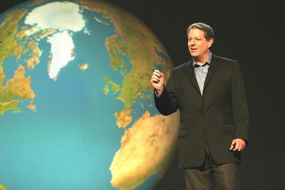 《不願面對的真相》(An Inconvenient Truth),受各界評鑑譽為近代影史最重要的電影之一的影片,由導演戴維斯古根漢(Davis Guggenheim)執導,忠實呈現高爾費時40年來的研究成果,紀錄他全程流暢而精采的演講,講述全球暖化將造成與已產生的危機,電影後續引發極多相關討論,國家郵報(National Post)甚至直接將該片列為2006年十大佳片的首位,直言「具有改變世界的強大力量」。2006年奧斯卡獎頒獎典禮讓這部奪下最佳紀錄片小金人的電影再度成為話題,我在去年10月當電影在台上映時即進戲院欣賞,1小時40分的震撼,一場內容豐富、旁徵博引的演講,在高爾以幽默生動的方式,誠懇地具體呈現出那些被大家誤認為不是問題,但卻造成環境生態極為嚴重的影響。他駁斥外界指控科學家對全球暖化現象並無共識的看法,有人認為全球暖化只是太陽活動加強造成的自然反應,但高爾在演講中舉證歷歷,指出除了太陽活動加強外,全球暖化最主要是源自於更多的人為因素,大肆使用化石燃料,產生溫室氣體。倘若不立即控制這些因素,地面將不斷升溫,吸收太陽輻射而造成更強大的溫室效應,使地球成為悶燒鍋,全球暖化現象嚴重,海平面因此上升,低窪或海島國家恐將面臨沉溺海底、甚至滅國的困境。
