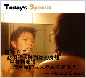 法國女性主義學者 Helene Cixous 提出「軀體寫作」的概念,她認為女性必須書寫女性,通過寫作放縱軀體生命,衝破傳統女性軀體修辭學的種種枷鎖,用自己的血肉之軀充當寫作所依循的邏輯,才能擁有詮釋世界的權力。性別是在社會價值的判準下所「形成」的,如此二元劃分的用意在於「幫助了解」,但這樣被建構出的了解卻常引起「誤讀」,尤其是在這個「男不男、女不女」性別界線模糊的世代,既有的價值法則勢必要摧毀隔閡,重新用一套尚走不入主流的另類方式,再建構。