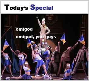 以華麗的歌舞開場,將姐妹宿舍同住的喧鬧、Elle 期待男友求婚而girl 們也為之興奮、挑選衣服展現 blonde 傻雖傻卻一點都不笨,尤其對流行時尚更是瞭若指掌的片段,電影用了好幾十分鐘鋪陳的情節,舞台劇以一首Omigod You Guys 就淋漓盡致表現出來,完全到位。