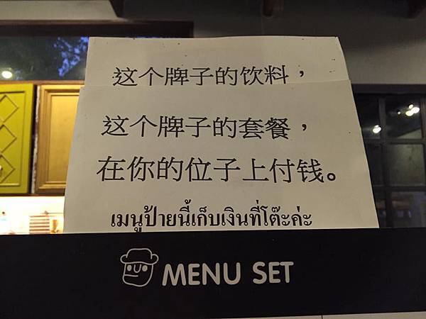 仔細研究牌上的中文仍看不太懂,這是我在清邁看到的第一個菜中文,應該也算菜英文,我對照語意不清的中英文,猜測他們要表達的應該是「在你的生肖年投錢捐款」。但我看了許久,一直想不透那個阿布是從哪翻譯過來的?冒險王阿布嗎?這就是典型的「每個單字可以對照到,但拼成句子就看不懂」的最好例子。