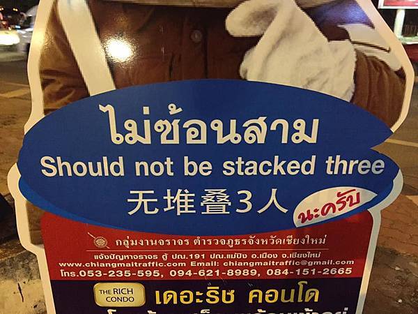在路上看到的交通警示牌,宣導「騎車不得三貼」的交通規則。但翻譯成堆疊3人讓我腦海浮現出三個人用疊羅漢方式在堆疊騎車,只是請問是要第幾層的那個負責催油門呀?