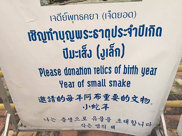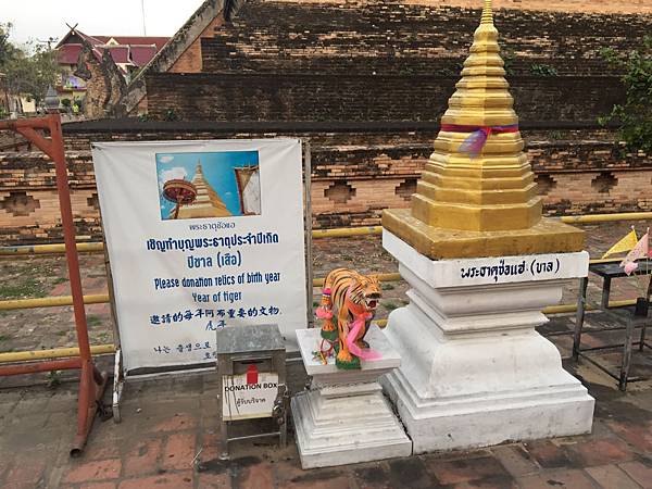 有720年歷史的清邁古城,光是寺廟就有超過300座,看到柴迪隆寺Wat Chedi Luang有擺12尊生肖動物小雕像跟捐獻箱時才發現,原來泰國跟我們一樣也是有12生肖,且內容跟順序完全相同。