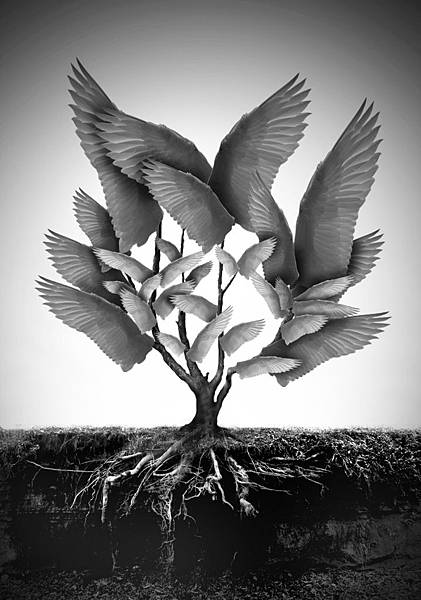 傲然挺立的大樹讓人永遠猜不透他的年齡,他的綠如此油亮,枝葉扶疏自成一蔭,枝幹堅固,多年來倚立不搖,縱使風吹雨打、歷經地牛翻身,也無法撼動他的一絲一毫。年邁的樹伯心中其實滿滿感慨,偶爾抬頭望向天空,小鳥揮動翅膀穿梭自如的行動力總讓他好生羨慕。他的視線永遠跟不上鳥兒移動的速度,低頭看看自己,盤根錯節深植於這塊土壤,寸步難行,連想故無忌憚地伸個懶腰都是奢求。自己何嘗不想飛上天,一探這世界的全觀,自由飛翔自由呼吸,而不是侷限地當個井底之蛙,青春都耗盡了。