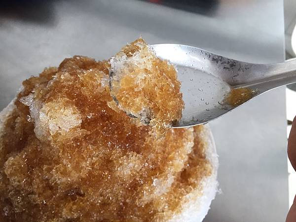 選完料後,老闆從冰桶內拿出大冰塊,用大家從小都熟悉的綠色刨冰機現刨冰,綿綿密密的,入口即化。有些店的冰是那種碎冰,跟料加在一起根本就是在吃冰的料,完全沒有吃刨冰的口感,刨冰的基本精神就是冰跟糖水呀!若要吃碎冰,我就想到小時候在我奶奶家,有個阿伯每天都會推著推車從巷子經過,每次時間差不多了,我們三兄弟都會趴在窗邊往外望,看到阿伯的車就立刻衝下去。阿伯的冰很特別,一樣是大冰塊,但他不是用刨冰機,而是拿出一把長長的挫刀現場挫,挫出來的冰是細細長長的冰塊,再淋上有濃濃香蕉油味的糖水,那才是我記憶中的古早味。
