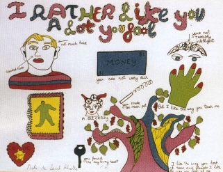 以前衛的方式創造藝術的妮基,對於感情態度也走在前頭。與首任丈夫哈利的婚姻雖有兩個小孩,但仍觸礁。妮基大可以繼續假裝無恙,與哈利安度餘生。但她不堪安置於如此乏味且空泛的生活之中,她忠於自己,不願放棄對於藝術的執著與對愛情的憧憬,面對輿論壓力與世俗眼光,妮基與興趣相投的丁格利終於有情人終成眷屬,結為連理。妮基的勇敢,是我在觀賞她作品背後所為之感動的。